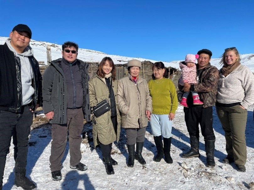 Bayaraa Munhtsog (Irbis Mongolia), Buyanbadrakh Erdenetsogt & his wife (Association for Protection of Altai Cultural Heritage) and Ashleigh (SLC) visit with nomadic herding family friends in the steppe during the first (unexpected) snow of the season – the earliest in 40 years! Understanding the needs of families living in snow leopard and wolf habitat is critical to successful conservation efforts.