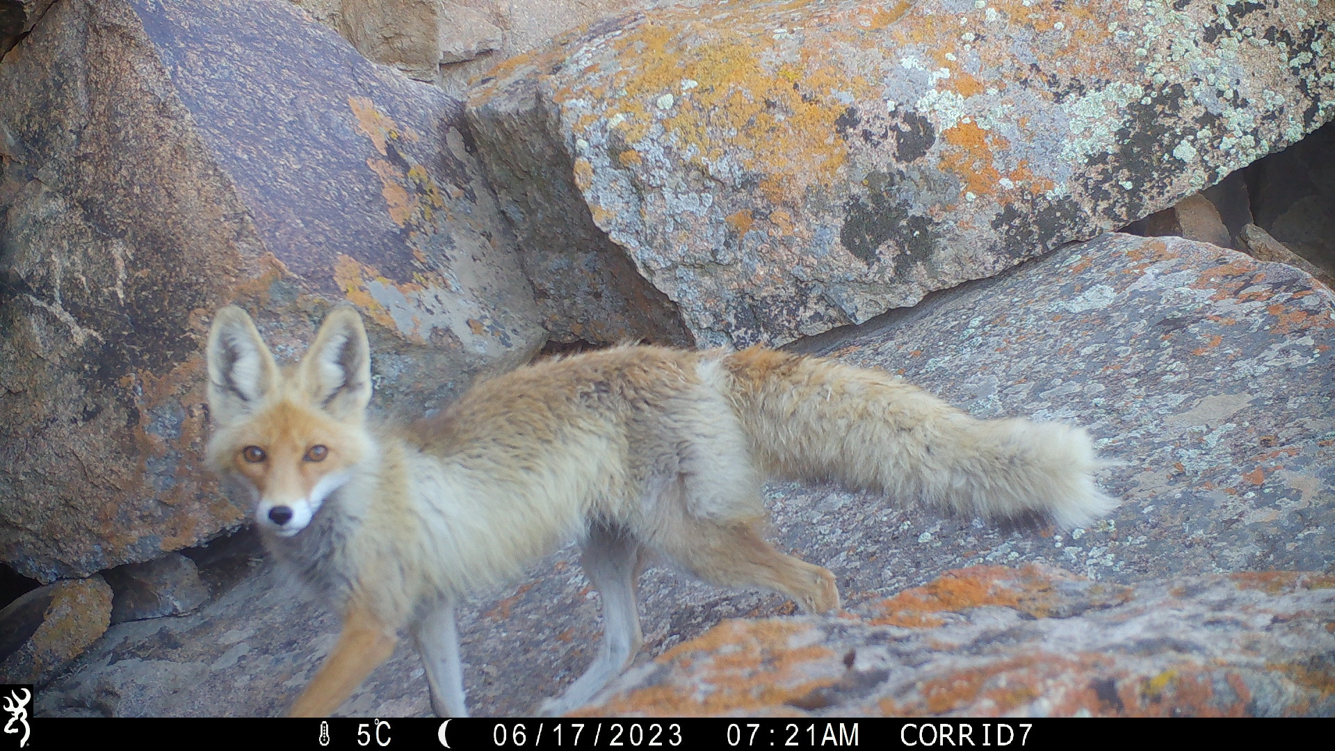 Beyond snow leopards, Wildlife Initiative’s cameras have revealed a complex carnivore community. Among these exciting discoveries is the frequent appearance of the Pallas’s cat, Otocolobus manul, known locally as “Manul.” These small cats, believed to be the oldest living cat species, live throughout Asia and the Middle East, preferring uplands, hilly areas, and steppes with rocky outcrops. In the study area, Wildlife Initiative has documented Pallas’s cats using the same rocky outcrops and narrow passages favored by snow leopards, suggesting these “stepping stone” mountains provide crucial habitat for multiple carnivore species.